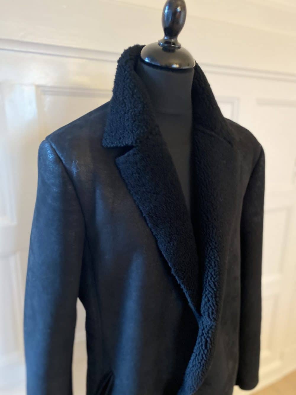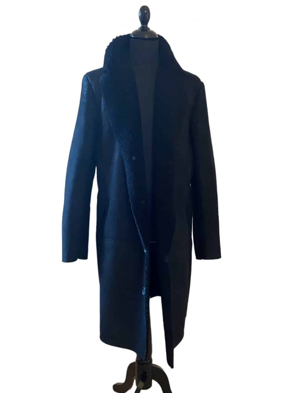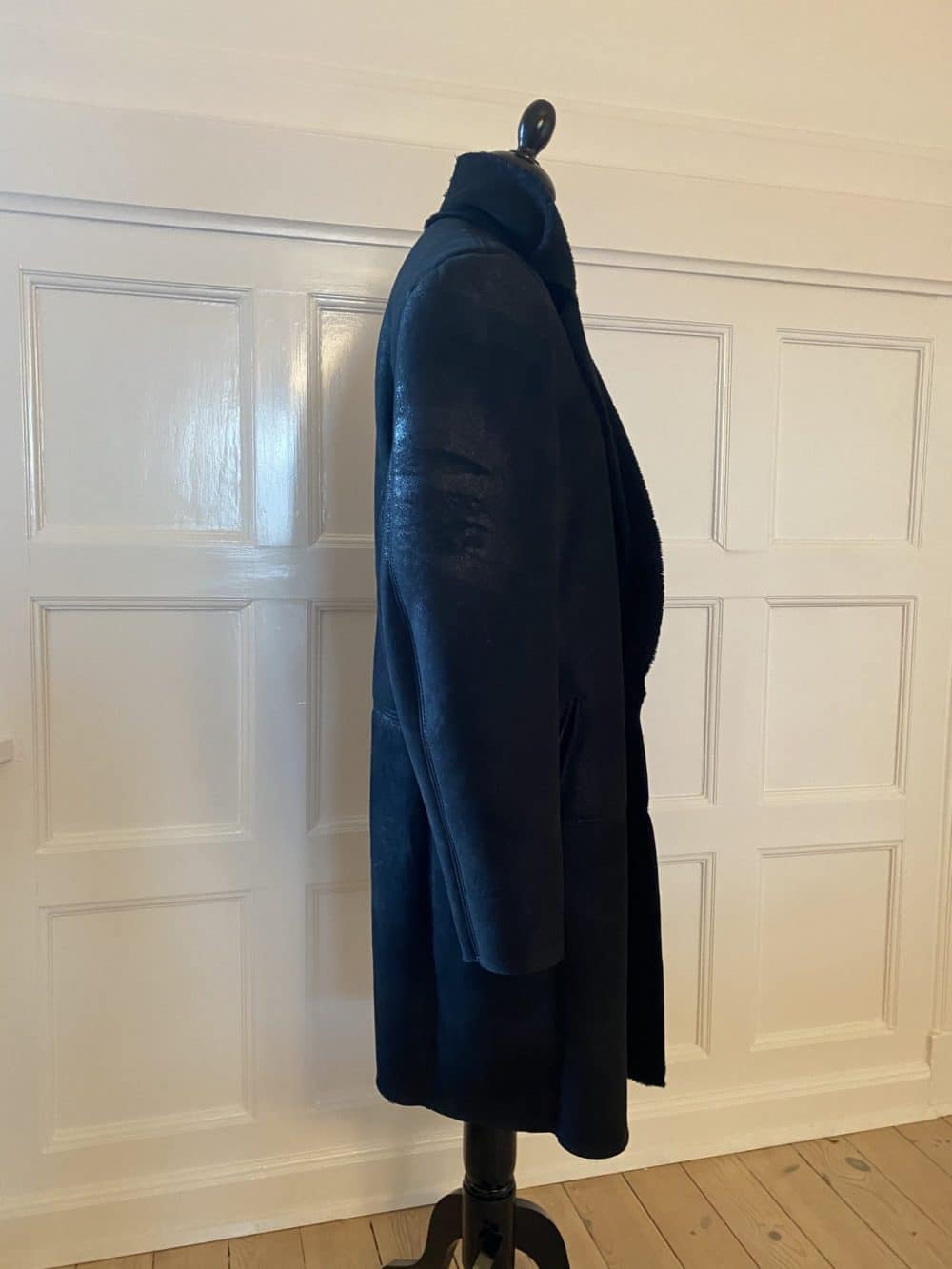 Lang slank habitfrakke med revers og knapper. Frakken er med rå kanter, hvilket giver et råt og let udtryk. Frakken er produceret i australske tynde rulam med krøllet uld og en spændende behandlet overflade som også er med til at give et råt udtryk. Frakken kan i butikken bestilles efter mål og i andre råvarer samt farver.
