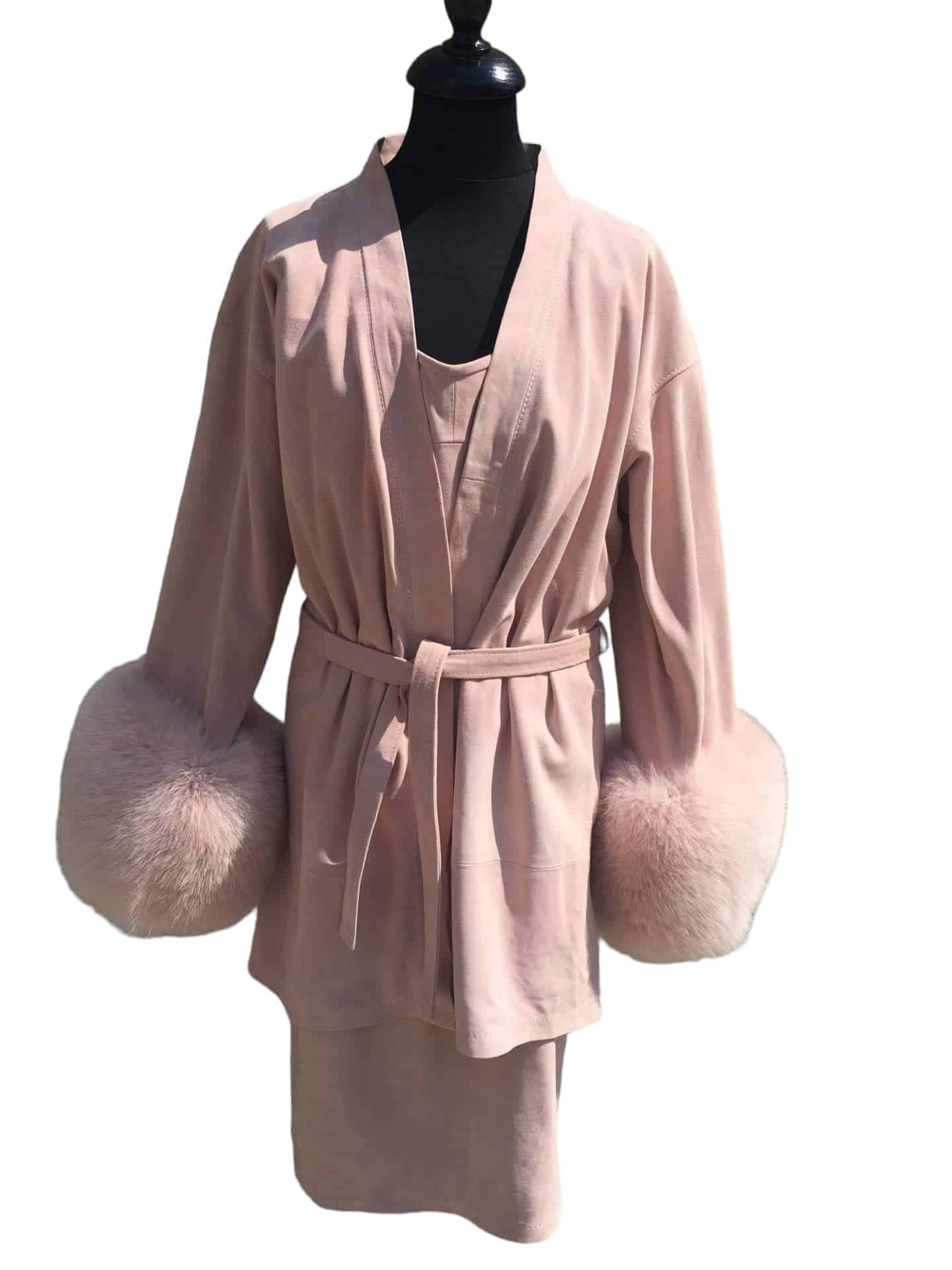 Kimonojakke i ruskind med bindebånd og opslag i ræv fra Kopenhagen Fur. Kimonoen fås i alle størrelser og i 25 forskellige farver på bestilling. Kontakt butikken for at se udvalg af farver.