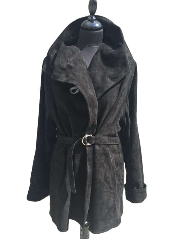 Model Ninna i ruskind. Ruskindsjakken har en stor krave og revers med smart og fleksibelt lukketøj. Jakken har en længde på 75 cm, men fås i alle størrelser og 25 forskellige farver. Kontakt butikken for at se udvalg af farver.
