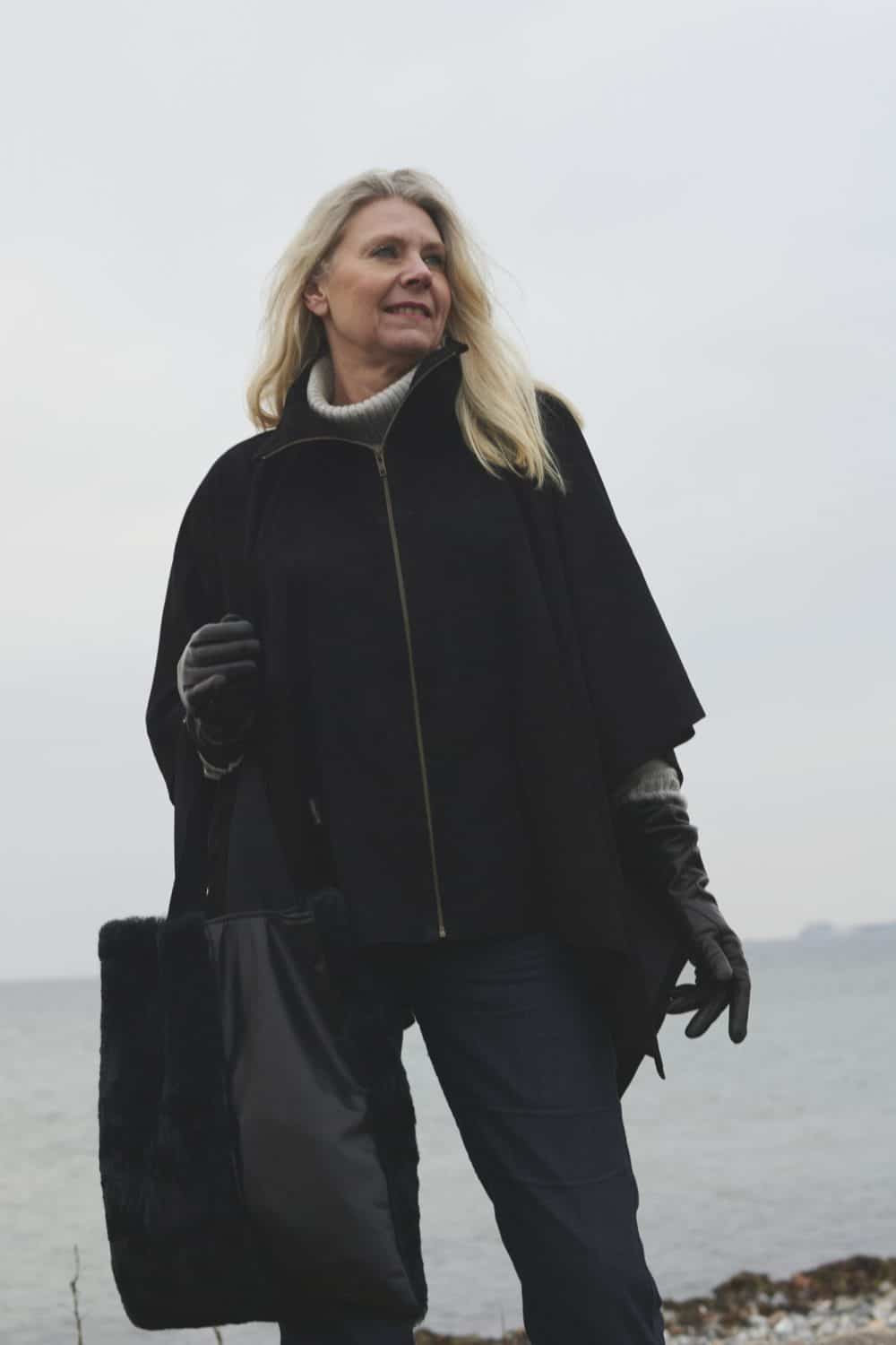 Poncho i lækker blød silkelam med lynlås og høj krave. Her vist i sort silkelam ruskind. Kontakt os for andre farver.